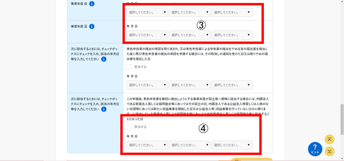 ④この申請後、青色申告書を最初に提出しようとする事業年度が設立第一期等に該当する場合には、「該当する」を選択。