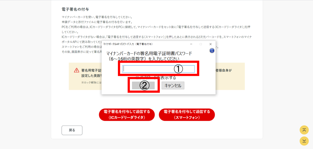 →①マイナンバーカードの署名用電子証明書パスワードを入力(6~16桁)