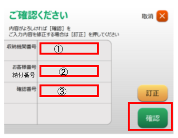 →①収納機関番号(5桁)を入力 ②納付番号(16桁)を入力 ③確認番号(6桁)を入力